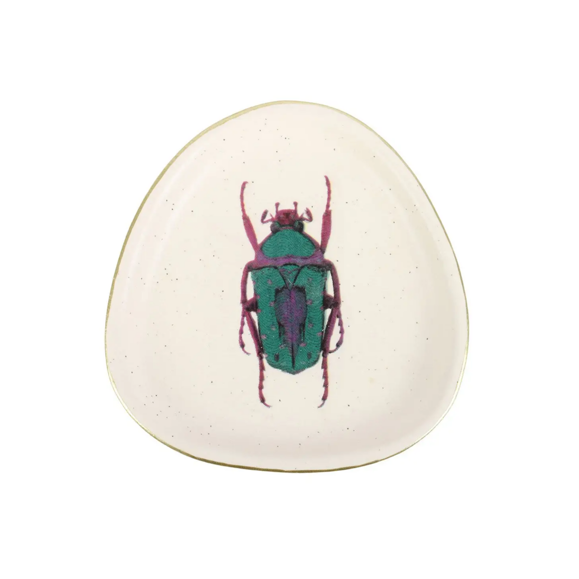 Add a touch of whimsy to any space with this ceramic trinket dish, adorned with a captivating beetle design. This non-perfect circle-shaped trinket dish features an off-white, speckled background finished with gold detailing for a sophisticated look. A beautiful decor piece for storing treasured trinkets and jewelry.