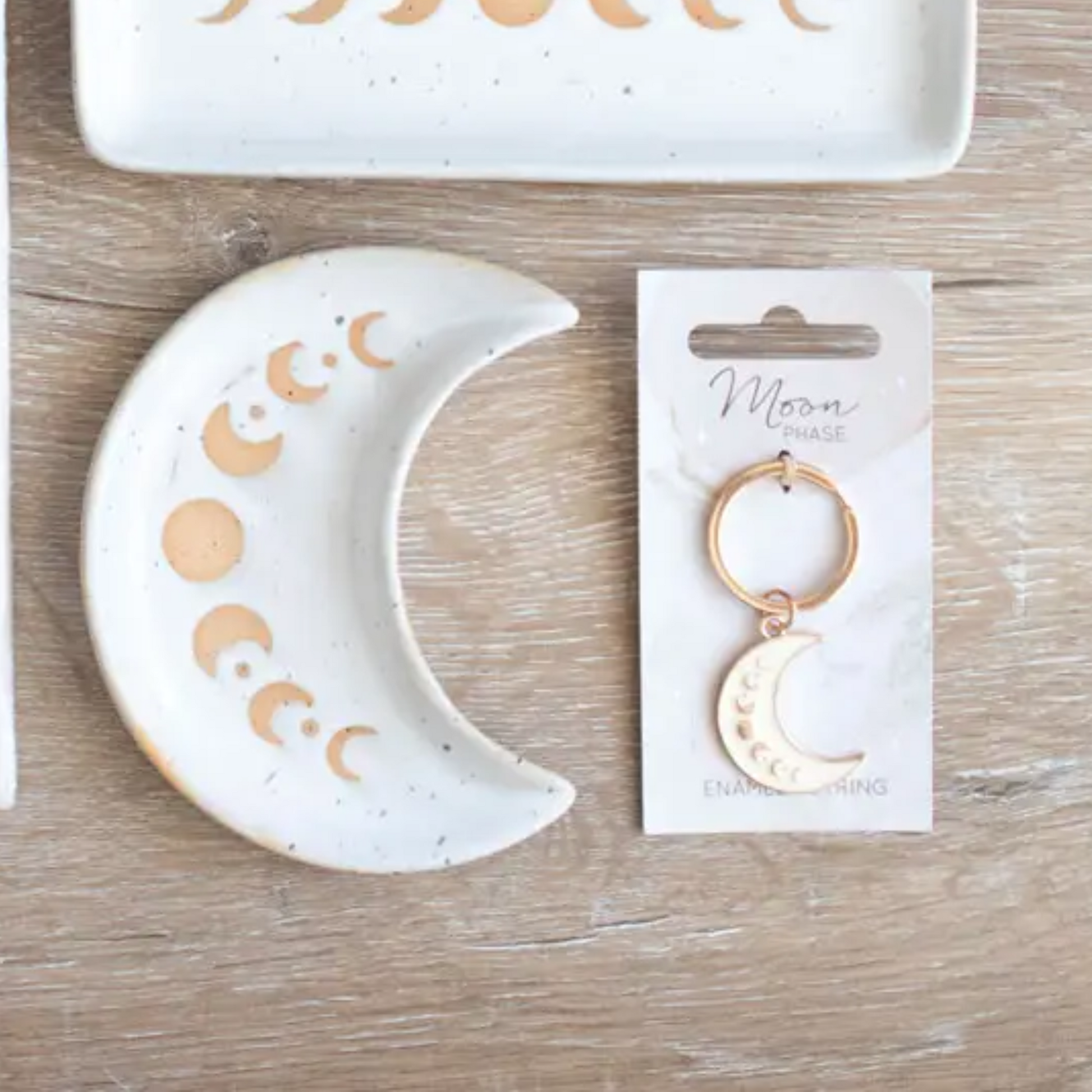 This lovely keyring features an enameled crescent charm with gold-tone moon phase design on a matching backing card.